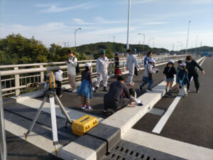新たに開通する桑部橋の渡り初めに合わせ、在良小学校・桑部小学校の3年生を対象とした現場見学会を開催しました。児童の皆さんは、複数人で協力しながら巻尺を使って距離を測るなど、楽しそうに取り組む姿が見られ、大変微笑ましい時間となりました。